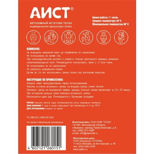 • Представляет собой герметично упакованный пакетик из мягкого материала, внутри которого находится экзотермическая смесь порошка железа, соли и влагоудерживающей композиции. При извлечении из герметичной упаковки за 3-10 минут нагревается до температуры 45-55 °С. Выделение тепла происходит за счет окисления железного порошка кислородом воздуха
