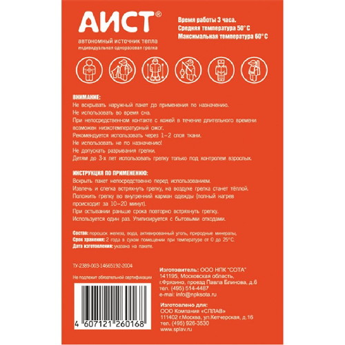 • Представляет собой герметично упакованный пакетик из мягкого материала, внутри которого находится экзотермическая смесь порошка железа, соли и влагоудерживающей композиции. При извлечении из герметичной упаковки за 3-10 минут нагревается до температуры 45-55 °С. Выделение тепла происходит за счет окисления железного порошка кислородом воздуха