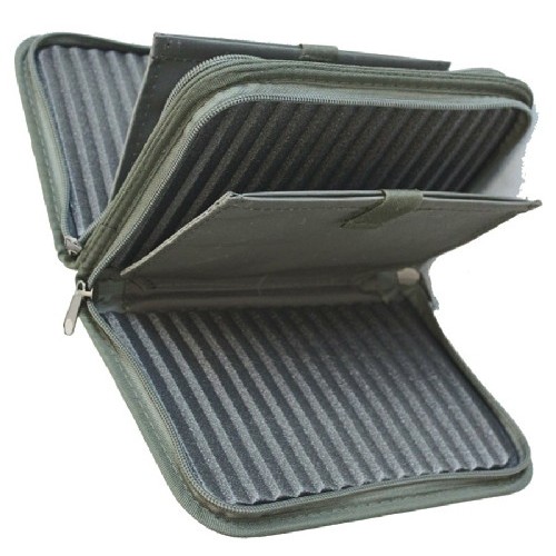 Выполнен в виде двойного кошелька на молнии со стойками для крепления блесен.
