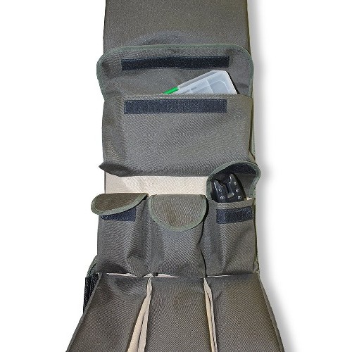 Имеет отстегивающийся плечевой ремень рюкзачного типа. 4 внешних кармана вмещают сигнализаторы или другую "мелочевку". Два внешних кармана вместят все ваши стойки. Имеет крупную молнию повышенной прочности.