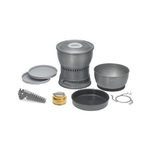 Посуда в наборе компактно складывается. Специальная складная ручка на горелке позволяет регулировать интенсивность пламени и выключать горелку. Кастрюли, сковорода с антипригарным покрытием, ветрозащита, подставка, держатель, крышка изготовлены из жесткого анодированного алюминия, а горелка изготовлена из латуни.