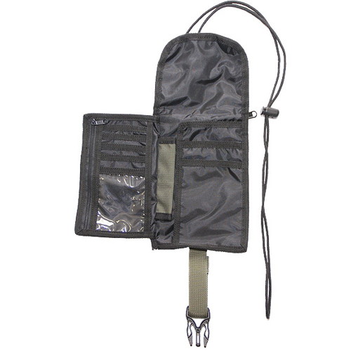 Кошелёк прямоугольной формы с возможностью ношения на шее. Для этого он оснащен достаточно длинным паракордовым шнуром. Выполнено изделие из полиэстрового плотного материала Polyester 600D, каждый срез хорошо окантован и прошит прочными нитями.
