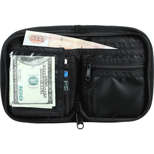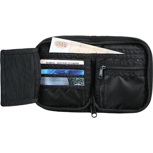 Небольшой кошелёк в открытом состоянии имеет размер 24×15 см изготовлен из материала Polyester 600D.