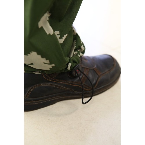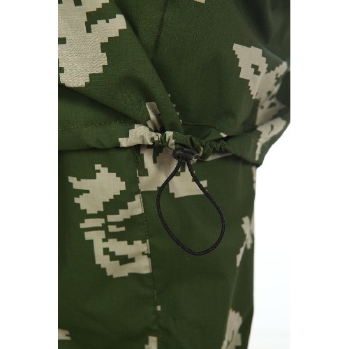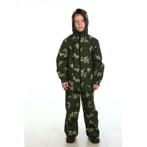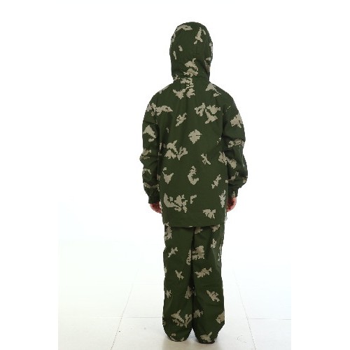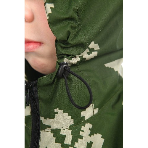 Куртка на молнии, свободного кроя, имеет 2 накладных кармана и капюшон, который регулируется резинкой с фиксаторами. Низ куртки и брюк с утяжкой.