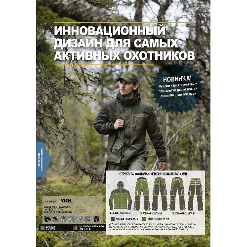 Костюм был разработан с учетом опыта наиболее активных охотников. Производитель постарался обьединить в нем лучшие водооталкивающие качества мембранных костюмов и дышащие свойства хлопковых костюмов.