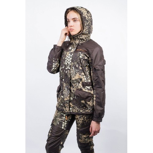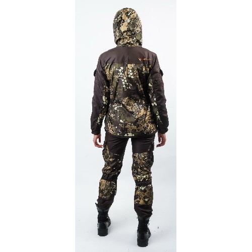 Подкладочный материал - сетка: 100% полиэфирная ткань со сквозной ячеистой структурой, применяется в местах, требующих повышенной воздухопроницаемости и влагоотвода. Костюм среднего объёма, анатомического кроя. Капюшон цельнокроен с воротником-стойкой и регулируется по глубине и объёму трикотажным шнуром с фиксаторами и наконечниками под цвет отделочной ткани.