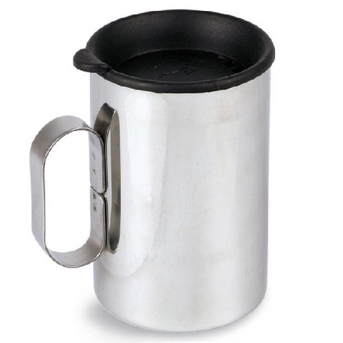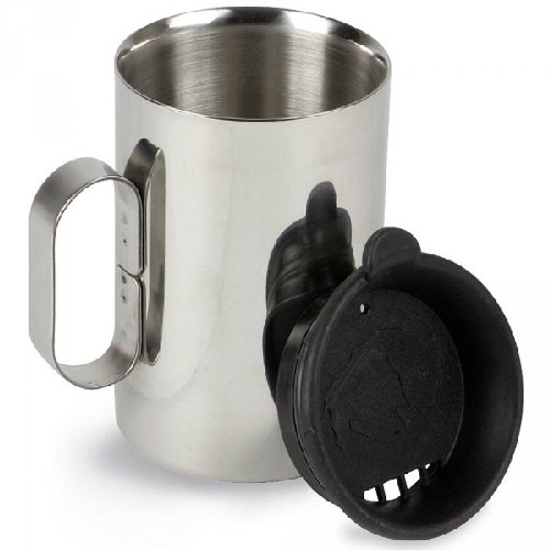 Туристическая кружка Tatonka Thermo Delux 400 с крышкой и двойными стенками. В термокружке есть удобная ручка, а на крышке расположен логотип Татонка. Кружка не обожжет руки даже если в ней будет налит кипяток.