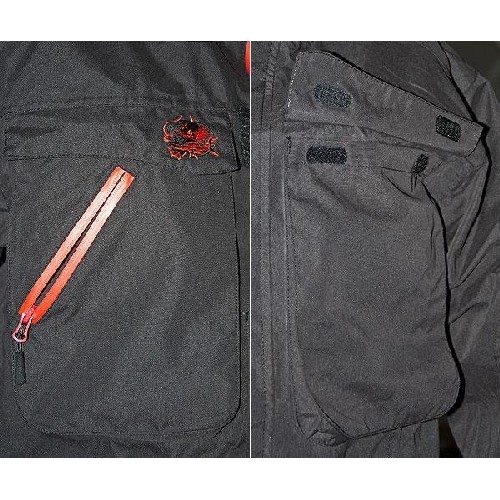 Куртка оснащена двумя боковыми карманами на водонепроницаемых «молниях» и двумя большими нагрудными карманами, в которые поместятся небольшие коробки с приманками.