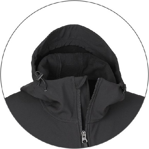 Воротник достаточно широкий и высокий для использования в комплексе с флисовой курткой. Форма капюшона рассчитана на удобное ношение поверх бейсболки или флисовой шапки совместно с активными стрелковыми наушниками. Полужесткий козырек.