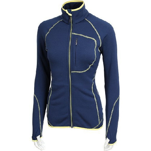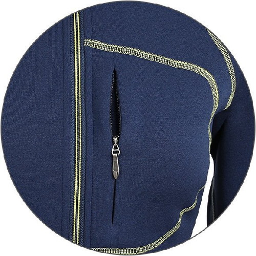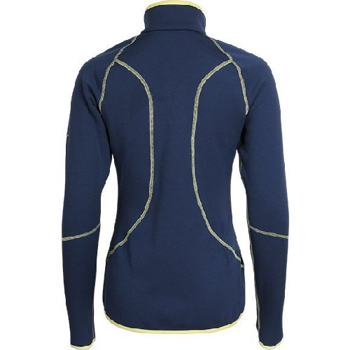 Высокий воротник-стойка с защитой подбородка от замка молнии плотно охватывает шею. Удлиненные рукава имеют отверстие под большой палец, что служит барьером от снега и ветра и не дает рукавам сбиваться под внешней курткой. "Плоский" способ формирования карманов направлен на удобство, но вместе с цветными отстрочками еще и формирует стильный вид куртки. Благодаря сетчатым мешковинам, карманы могут использоваться для вентиляции.
