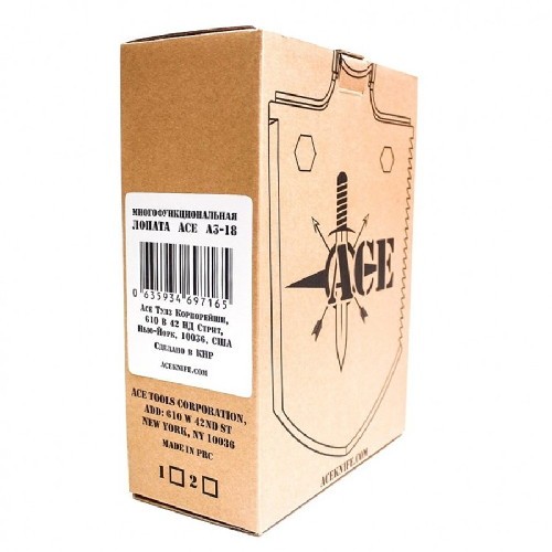 Инструмент изготовлен исключительно из качественных материалов, которые обеспечивают надёжность и долговечность изделия. Функциональные насадки, формирующие рукоять лопаты, выполнены из высокопрочного алюминиевого сплава, а само рабочее полотно — из высокоуглеродистой стали. Общая длина модели ACE A3-18 в рабочем состоянии равна 78.8 см, ширина полотна — 12.8 см.