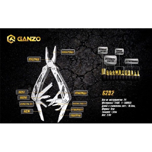 С мультитулом Ganzo G202 можно выполнить самые разнообразные виды работ. 12 сменных насадок в комплекте подойдут практически для всех видов винтов и гаек, которые могут понадобиться. А с помощью ножей и ножниц при необходимости можно разрезать даже очень плотные материалы.