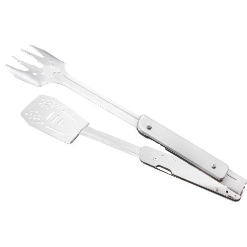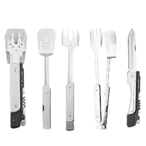 Непосредственно к ножу крепятся лопатка и вилка. Оба инструмента сделаны полностью металлическими, со складной ручкой. У вилки 4 зубчика с зазубринами, чтобы мясо не соскальзывало с неё. Есть отверстия для стекания жира. Такие же отверстия сделаны и на лопатке. Вилку с лопаткой можно соединить таким образом, чтобы они играли роль щипцов.