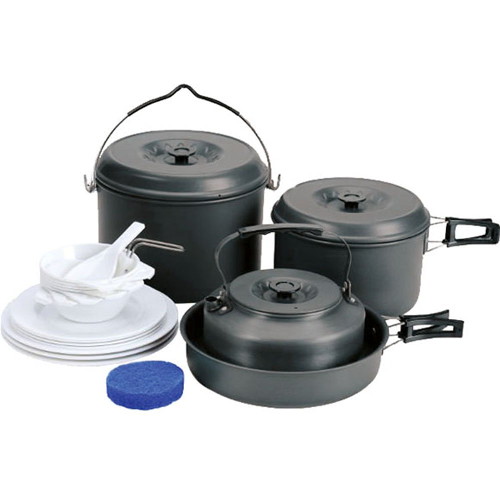 Для сервировки стола предлагаются 7 плоских и 7 глубоких (могут служить и кружками) тарелок из полипропилена. А губка позволит вам отмывать посуду даже в ледяной воде горных речек.