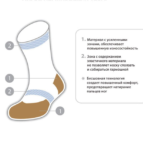 - Зона с содержанием эластичного материала не позволяет носку сползать и собираться гармошкой