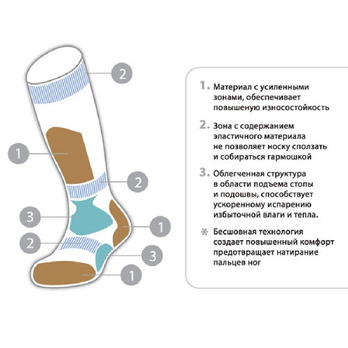 Высота носков также хороша и для лыжников, которым ботинки не пережимают ногу в месте резинки и для сноубордистов, у которых носок не будет сбиваться, оставляя открытые участки тела (хоть и под штанами, все равно холодно!).