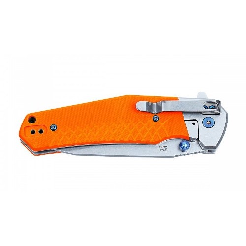 У модели Ganzo F7492-OR длина клинка составляет 87 мм, нож заточен по технологии plain, которая представляет собою классическую ровную заточку. Шлифовка Stone wash сделала поверхность лезвия не отражающей лучи и почти матовой.
