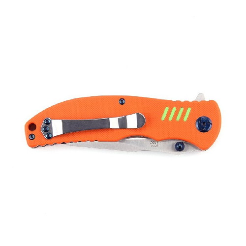 Рукоятка модели сделана не менее качественной, нежели его клинок. Она сформирована при помощи двух накладок из G10. Этот материал прочнее обычного пластика, ведь он является композитным и создан путем объединения стекловолокна с одной из эпоксидных смол. Чтобы нож надежнее лежал в ладони, накладки специально сделаны текстурированными. На одной из них имеется клипса, чтобы нож можно было закрепить на поясе. Еще одна особенность рукоятки в данной модели — это небольшие светонакопительные вставки, которые сделаны с использованием люминесцентной краски. Они позволяют легко заметить нож даже в полной темноте.