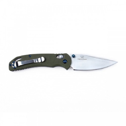 Лезвие этого ножа не боится воздействия воды и приспособлено для работы с большим количеством материалов разной твердости. Оно сделано из сплава 440С, объединившего защищенность от коррозии с довольно высокой твердостью металла. Размер лезвия составляет 77 мм. Оно изготовлено в классической форме clip-point и ровно заточено. Именно такой вариант заточки не только считается универсальным, но и легче всего подтачивается в походных условиях. Нож отполирован по методу satin wash, из-за чего на клинке заметны штриховые следы от прохода абразивом.