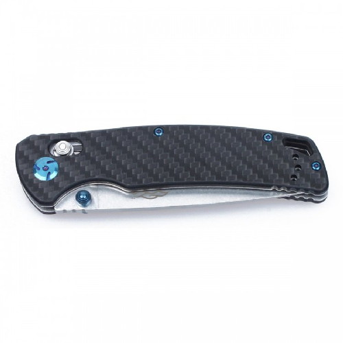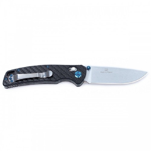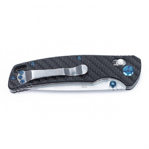 Накладки на рукоять изготавливаются из углеродного волокна Carbon fibre. Они тщательно подогнаны к стальным лайнерам, лежащим в основе рукояти и полностью повторяют их контуры. На одной из плашек установлена съемная стальная клипса, позволяющая надежно закрепить нож на кармане, лямке рюкзака или другом элементе одежды/снаряжения. В торцевой части присутствует специальное отверстие для крепления темляка.