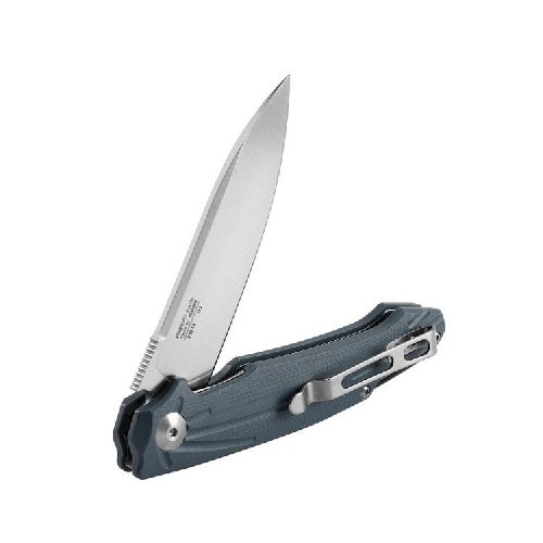 Рукоятка ножа сделана максимально удобной для длительной работы с инструментом. Она получила сдержанность современный дизайн. Накладки для ручки сделаны из композитного стеклопластика G10. В данной модели они могут быть окрашенными в чёрный, серый или оливково-зелёный цвет.