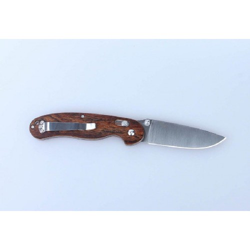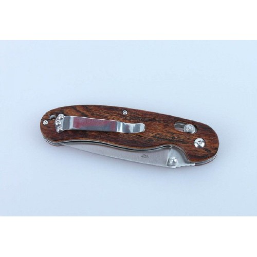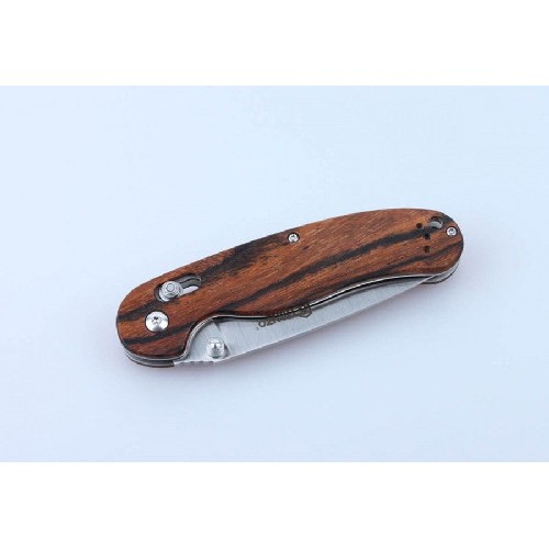 Рукоятка в данной модели привлекает особое внимание. Ведь она выполнена из натурального дерева. Производители выбрали древесину дерева эбени, которая относится к ценным сортам и известна своей высокой плотностью. Темная поверхность рукоятки с выраженной текстурой дерева понравится даже наиболее искушенному ценителю ножей. Тем более, что дерево прекрасно показало себя в длительной эксплуатации, а также использовании ножа в условиях высокой или низкой температуры. На рукоятке закреплена металлическая клипса для прикрепления ножа на ремне. Есть в ноже и еще один фиксатор — для клинка. Это замок типа Axis Lock, известный надежностью и длительным периодом эксплуатации. У него штифтовая конструкция, которая позволяет открыть нож, используя только одну руку.