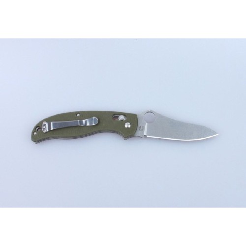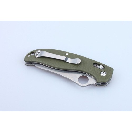 Для рукоятки также задействованы современные материалы. Это G10 – пластик с композитной структурой, который гораздо прочнее других разновидностей пластика. Чтобы рукоятка ножа удобно лежала в руке, ей придали форму, повторяющую очертания сжатой ладони. А поверхность пластика — с накаткой, которая препятствует проскальзыванию во влажных руках. На одной из сторон, зафиксирована клипса из стали, которая служит для страховочного крепления ножа во время его переноски. С этой же целью, в рукоятку можно продеть темляк.