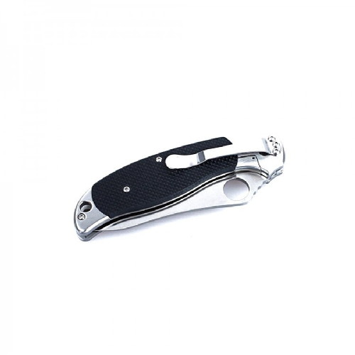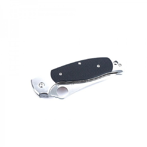Рукоятка ножа скомбинирована из двух материалов: стали и стеклопластика. Стальные элементы — это основа, окончания рукоятки с обеих сторон, а также прижимная клипса. Все они тщательно отполированы, что добавляет ножу презентабельности. Центральная часть с обеих сторон представлена накладками из G10. Эта разновидность пластика прочнее других, а потому хорошо себя зарекомендовала в производстве ножей.
