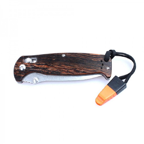 Рукоятка ножа выполнена из наиболее традиционного для этого материал — натурального дерева. Оно покрашено в коричневый цвет, но таким образом, что хорошо видна структура древесины. Внутрь рукояти встроен замок Axis, который делает использование ножа абсолютно безопасным. Когда нож сложен, этот замок не дает ему открыться, чтобы клинок можно было переносить в кармане. А фиксация открытого клинка позволяет без опасений работать с ним под нагрузкой.