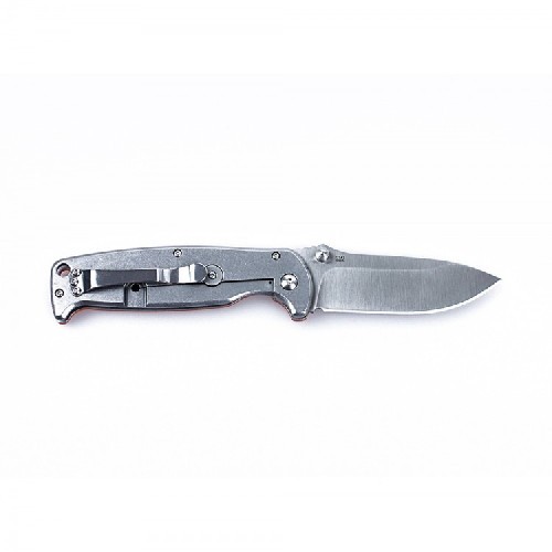 Рукоятка ножа получила накладку лишь с одной стороны. Она сделана из композитного материала G10, обладающего большой прочностью и долговечностью. К металлической основе рукоятка прикручена тремя болтами. Её поверхность покрыта мелкой текстурной накаткой, способствующей тому, чтобы нож не скользил в ладонях. С обратной стороны материал рукоятки — это сталь с матовой обработкой поверхности. Здесь же прикреплена и металлическая клипса, хотя при желании, её можно переставить на лицевую сторону.