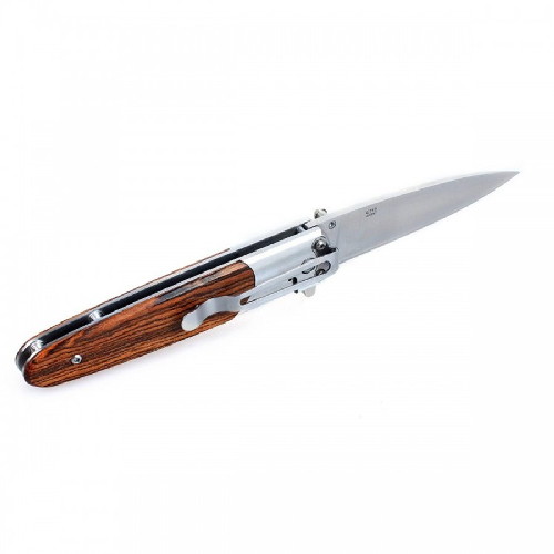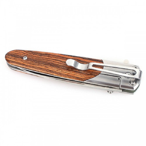 Рукоятка ножа Ganzo G743-1-WD1 комбинированная. Участок около клинка, примерно на треть длины, также сделан стальным и обработан тем же методом, что и лезвие. На остальной части, с обеих сторон рукоятки закреплены накладки из дерева. Они прикручены к основе двумя небольшими болтами. С одной стороны рукоятки закреплена клипса, также выполненная из стали. Возможность ее переустановки в другом положении для данной модели не предусмотрена.