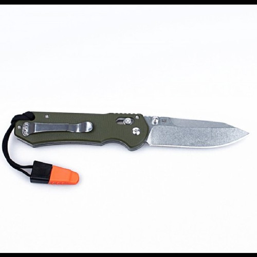Рукоятка ножа получила две накладки из стеклопластика G10. Он превышает по качеству другие виды пластиков и сравним прочностью с металлом. Помимо того, такая рукоятка не много весит, не подвержена коррозии и не впитывает воду. Накладки крепятся тремя маленькими болтами и одним более крупным. С одной стороны рукоятки также прикручена клипса, чтобы нож можно было повесить на ремень. В зависимости от предпочтений пользователя, ее можно переставить и на другую сторону. Рисунок на поверхности рукоятки — это мелкая геометрическая накатка.