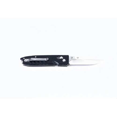 Для лезвия используется хорошая по качеству сталь 440С. Она относится к категории нержавеющих, но довольно твердая, чтобы сохранять острую заточку на протяжении длительного времени. Заточен нож полностью гладко, а форма клинка этой модели — drop-point, с острым кончиком. Поверхность клинка блестящая и обработана сатинированием. После этой обработки на металле видны небольшие штриховые полосы поперек клинка, указывающее направление обработки.