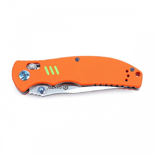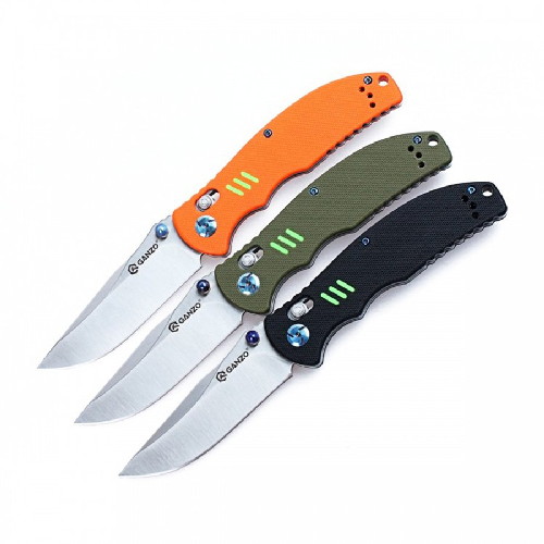 Рукоять составная, накладки выполнены из высокопрочного полимерного материала G10 и могут быть окрашены в один из трёх стандартных для ножей Ganzo цветов (чёрный, темно-зеленый и оранжевый). Особенностью рукоятки являются люминесцентные вставки в виде трёх небольших ярко-зеленных полосок. Полоски нанесены с обеих сторон рукояти и при установке стандартной клипсы не скрываются за ней. Данная особенность позволяет найти нож даже в кромешной темноте, ведь яркие, зеленые вставки довольно сильно выделяются на общем фоне.