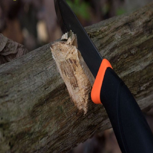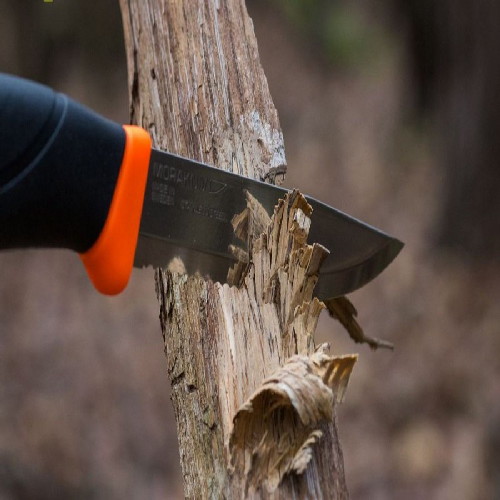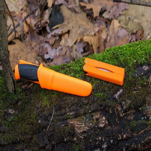 Эргономичная рукоять изготовлена из прорезиненного пластика с ярко-оранжевыми вставками, что позволит найти нож даже в ворохе листвы. На поверхности рукояти имеются насечки и тиснение в форме надписи Morakniv, что способствует надежному контакту с рукой. По традиции модель укомплектована пластиковыми ножнами оранжевого цвета, имеющими специальное крепление для размещения на поясе.