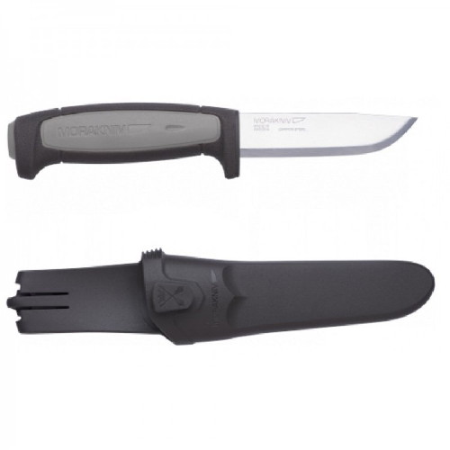 Нержавеющая сталь, примененная для производства клинка, имеет высокое содержание углерода и потому наделяет клинок высокой твердостью и прочностью, однако, при этом, он подвержен ржавчине. Именно по этой причине, производитель рекомендует после использования ножа, вытирать его лезвие насухо. Эргономичная рукоять сделана из прорезиненного черного пластика с вставкой серого цвета, на которой выгравирована надпись Morakniv. В области гарды, имеется удобный упор, оберегающий руку от пореза при работе.