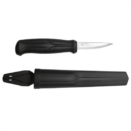 Ручка этого ножа сделана максимально удобной, чтобы нож было удобно держать во время больших нагрузок и работать ним долгое время. В качестве материала для нее выступает пластик. Рукоятка окрашена в черный цвет. Такого же цвета и ножны, которые также сделаны пластиковыми. Сам нож держится в чехле плотно и не выскользнет из него случайно. Ножны целиком закрывают клинок, защищая его от грязи и контакта с окружающими предметами. Крепление ножен позволяет повесить их на ремень, продеть лямку рюкзака или же дополнительно пристраховать с помощью темляка. Дома такие ножны можно повесить на крючок.