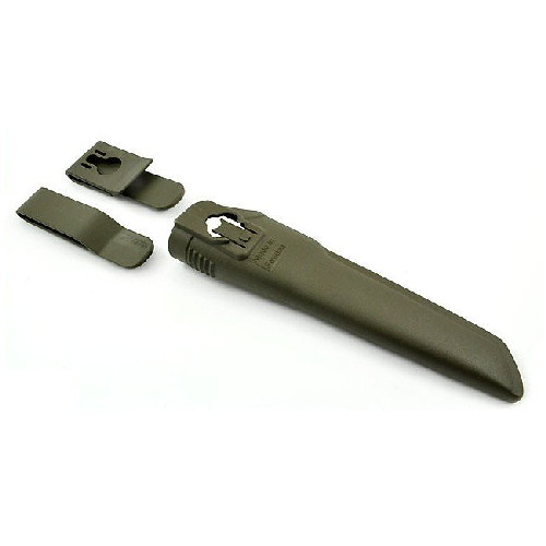Нож имеет пластиковую рукоятку и комплектуется пластиковыми ножнами защитно-зеленого цвета с креплением к поясу.