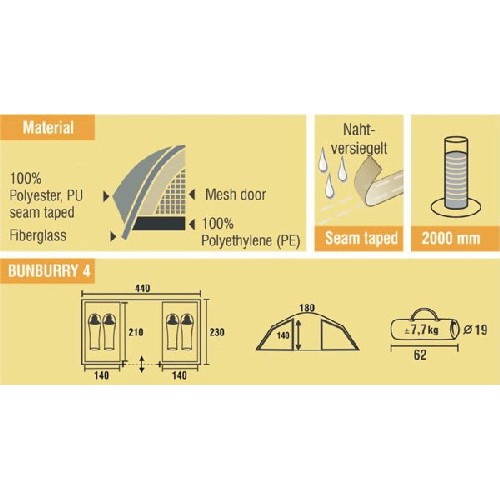 Палатка Bunburry 4 Best Camp - большая кемпинговая палатка для отдыха большой компании или семьи. Конструкция с внешними дугами позволяет создать обширный купол для столовой и кухни. Подвесив две спальни, можно разместить по два человека в каждой спальне. Особенно это удобно, когда в поход выезжают две пары или для создания отдельной детской спальни.