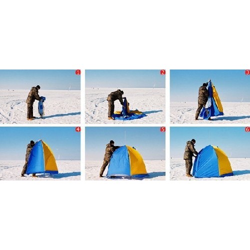 Крепление палатки ко льду производится растяжками от дуг каркаса.