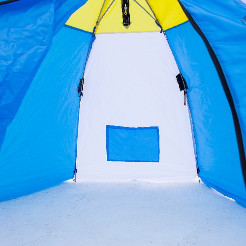 - Ветрозащитная юбка по периметру палатки легко закрепляется снегом, повышая ее ветроустойчивость при сильных порывах ветра и создает мощный барьер от проникновения внутрь холодного воздуха и задувания снега