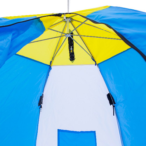 - Продуманная конструкция классической дышащей зимней двухместной рыболовной алюминиевой палатки-зонт звезда Стэк типа зонт схожа с конструкцией обычного зонта, что обеспечит минимальную затрату времени и сил на ее сборку, установку или демонтаж