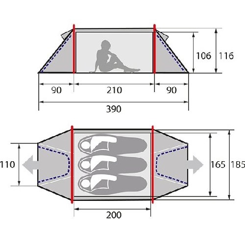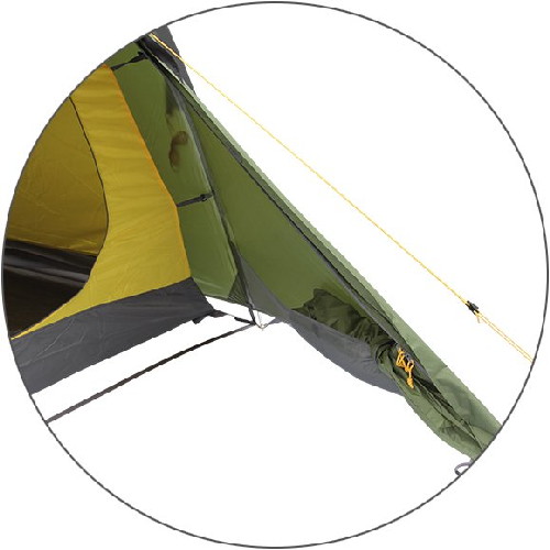 - Благодаря большим вентиляционным отверстиям над входами, палатка обладает хорошей проточной вентиляцией (в новой версии козырьки не обязательно растягивать);