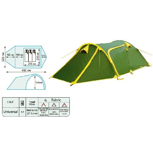 Внешний тент палатки устойчив к ультрафиолетовому излучению и имеет пропитку, задерживающую распространение огня.