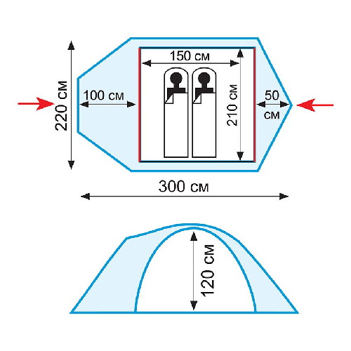 Размеры палатки 150 х 210 см - это два полноценных спальных места. Высота 120 см.