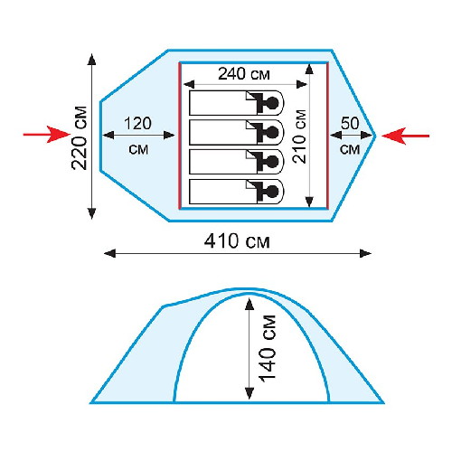 Сначала ставится внутренняя палатка, сверху накрывается тентом, дополнительная дуга тамбура продевается в сквозной тканевый карман на тенте.
