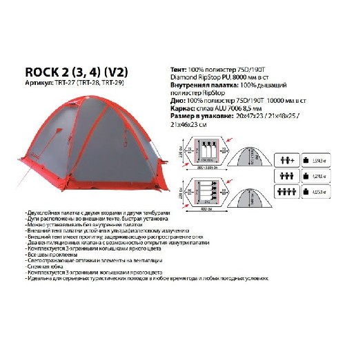 Палатка для экстремальных условий Rock 3 V2 имеет два входа и два тамбура. Палатка ставится очень просто: дуги продеваются в тканевые сквозные карманы для дуг на внешнем тенте. Внутренняя палатка крепится изнутри. Или не крепится.