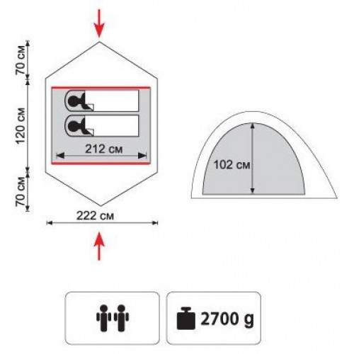 Внешний тент из полиэстера Diamond RipStop, не растягивается от влажности и жары, не съеживается от сухости и холода. Рипстопные элементы (толстые нитки в структуре ткани) не дадут маленькой зацепке или дырочке от искры расползяться дальше. Водостойкость тента 8 000 мм, это очень много. Полиуретановое покрытие защищает и от ультрафиолета.