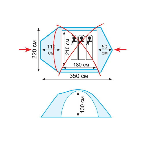 Благодаря расположению дуг во внешнем тенте палатка быстро и легко устанавливается и ее можно использовать без спального отделения.