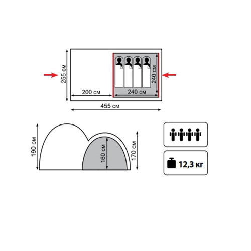 В тамбур ведет единственный вход. Полог можно поднять и закрепить на стальных стойках. Полог, как и дверь в спальню, двухслойный, с москиткой. На боковых стенках прозрачные окна.
